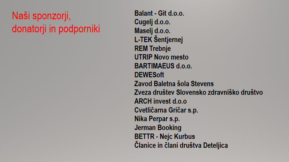 – Iskrena zahvala vsem našim sponzorjem, donatorjem in podpornikom: Shell Adria, ISKRA PIO – Šentjernej, Simič in partnerji d.o.o., Bettr, občina Kamnik, UniCredit Bank, EGIDA-M računovodstvo D.O.O., DeweSoft, Balant Git d.o.o., Cugelj d.o.o.,